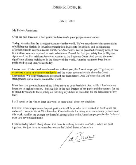 In his withdrawal letter touting his achievements, he says we ‘overcame the pandemic.’