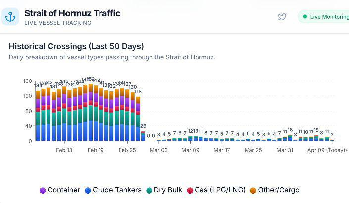 First off, there is still nothing moving through the Strait of Hormuz. Yesterday, just two tankers made it through. On Thursday, three. And of those that have made it through, it’s only been oil. No gas, no fertiliser, no plastics, no aluminium, no helium. Nothing for six weeks. Pre-war, between 130 and 150 ships transited daily carrying all manner of goods.