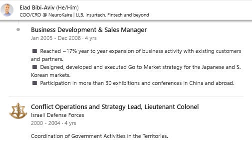 NeuroKaire, a personalised medical care company, is another company receiving EU funds led by a probable war criminal. Its chief executive Elad Bibi-Aviv, was a lieutenant colonel during the second intifada when Israel committed numerous atrocities. His LinkedIn profile says he was specifically responsible for coordinating ‘government activities in the Territories’ i.e. Gaza and the West Bank, during the period.