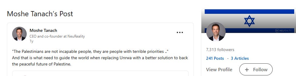 NeuReality is another Israeli AI start-up backed by Horizon cash. NeuReality, which makes processing units used to train AIs, is led by Moshe Tanach, a run-of-the-mill Jewish Israeli supremacist. Last year he posted on LinkedIn about the need to dismantle UNRWA, the UN agency which provided a huge amount of civil services, including food, to Palestinians in Gaza. The dismantling of UNRWA enabled Israel to wage its campaign of starvation on Gaza.