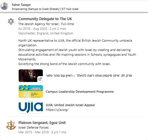 The EU also gave millions in Horizon grants to launch a European Innovation and Technology Hub in Israel. Part of the team at the EIT Hub Israel is Sahar Sazgar who served in the IDF’s Egoz Unit, a specialist branch tasked with secretive commando operations including assassinations.