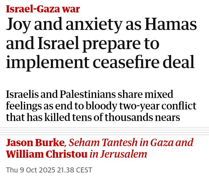 For now thankfully, the genocide has stopped. And we must desperately hope this ceasefire holds. But I’m not hopeful. Israel hasn’t ceased fire in its entire history. The history of Israel is a history of mass murder on whatever pretext they decide to use. Look at the West Bank, where over 900 Palestinians have been murdered since October 2023, thousands of homes bulldozed and olive groves destroyed. Look at Lebanon, where a ceasefire is breached almost daily. Israel’s goal, generation after generation since 1948, has been to deny the Palestinians a homeland and use strategic moments of opportunity to carry out ethnic cleansing and land grabs. Talking of land grabs, the 20-point Trump plan, with its constant references to Israel’s ‘line’ in Gaza looks more like a blueprint for a land grab than an honest attempt at a secure future for the Palestinians.
