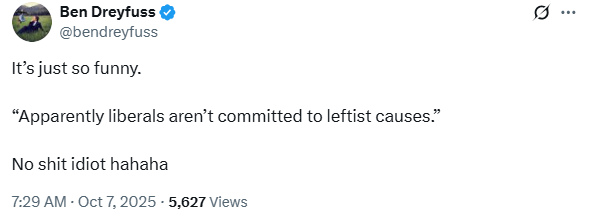 Anyway the most common retort to the article was ‘well done you figured out liberals and leftists have different politics.’ A liberal account by the name of Ben Dreyfuss with nearly one hundred thousand followers quote tweeted it entirely with the letters hahahahahaha and followed it up with this spectacular insight.