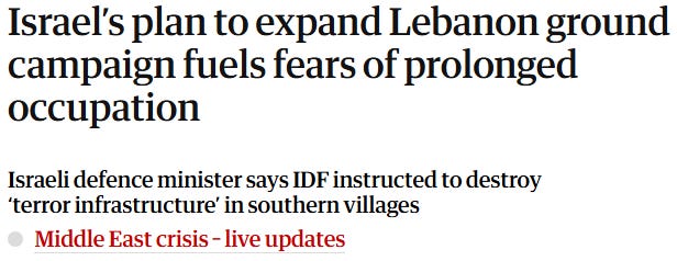 Also worthy of note is that Israel’s incursion, offensive or invasion is always into “southern” Lebanon, as if this is somehow not part of the overall entity of Lebanon. Again, a tactical choice intended to convey limit. Contrast this with how Russia’s invasion of Ukraine has always been described: as an invasion of Ukraine. And more often than not as “Russia’s full-scale illegal invasion of Ukraine.” It’s has never been “Russia’s incursion into eastern Ukraine.”