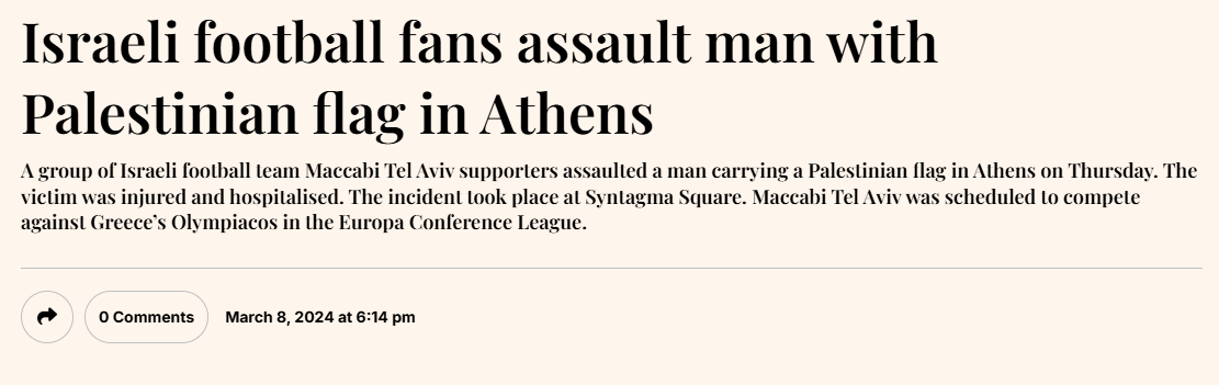 And when Macabbi Tel Aviv fans last travelled to Europe in November, to play Ajax in Amsterdam, they tore down Palestine flags, abused Muslim shop owners, burned a taxi, threw metal bars at police, chanted ‘death to Arabs’ and ‘fuck the Arabs.’ The Dutch police were very clear that the Israelis started it by burning a taxi being driven by a Muslim and tearing down Palestine flags. You might remember there was a similar pity party at the time designed to suggest the Israeli hooligans were the victims, not the perpetrators. (I didn’t write about it last time, but another around of propaganda signals a fucking annoying pattern I couldn’t ignore).