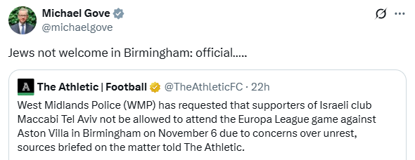 If you don’t know, I’m referencing the hysteria that has broken out across the English media after the police in Birmingham said that fans of Israeli football team Maccabi Tel Aviv shouldn’t visit the city when they play local team Aston Villa in a couple of weeks.