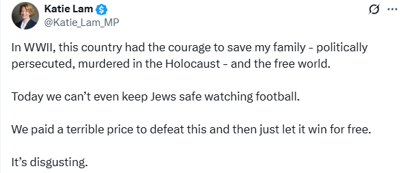 All the standard arguments are flowing forth, and some increasingly ridiculous ones too. British Tory party MP Katie Lam equated the right of Israeli hooligans to travel wherever they want with Jews fleeing the Nazi holocaust, suggesting that where Jews were once welcomed in Britain, banning Maccabi fans shows they are no longer safe.