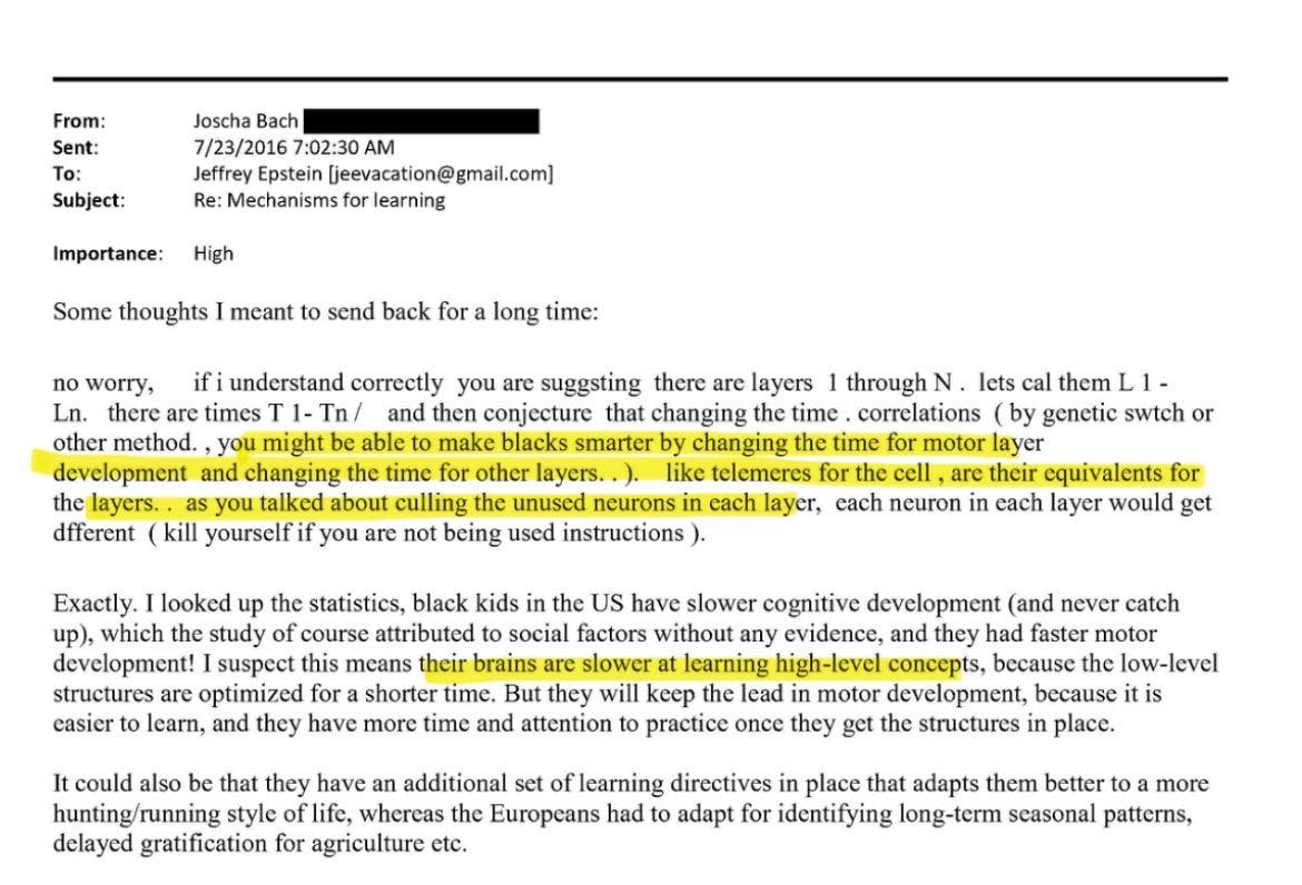 Dally also says her work showed her that AI models are “racist, ridiculously racist,” an observation supported, oddly enough, by the newly released Epstein emails. Joscha Bach, a leading AI researcher and cognitive scientist professor at the University of Cambridge, mused to Epstein about the possibility of using AI and neuroscience ‘to make blacks smarter.’ In a 2016 email, Bach stated confidently that the brains of black people ‘are slower at learning high-level concepts.’ Open, flagrant racism is a feature, not a bug, of big tech people and their AI models.