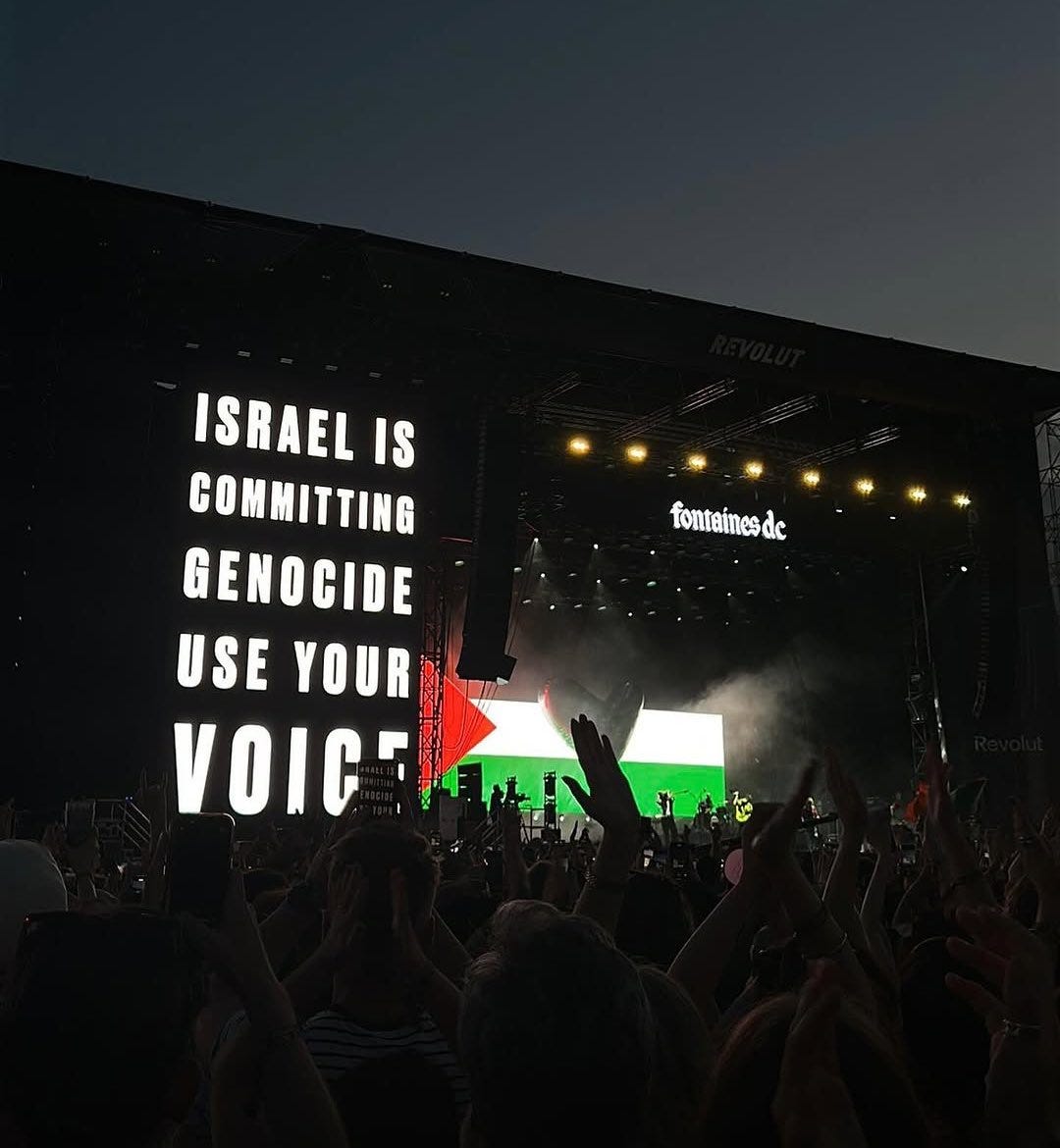 Which is why the protests for Gaza have never stopped. They continue every week in cities around the world. And now, high profile cultural figures are standing up for the first time and saying what needs to be said. Yesterday Pep Guardiola, the Manchester City football team manager and the most famous football manager in the world, said he ‘sees his children’ in the children being murdered in Gaza, and that if Israel isn’t stopped, ‘our children will be next.’ Musicians, from Sam Fender to Fontaines DC, are calling out Israel for genocide and displaying the Palestine flag at their gigs. This was just yesterday in Barcelona.