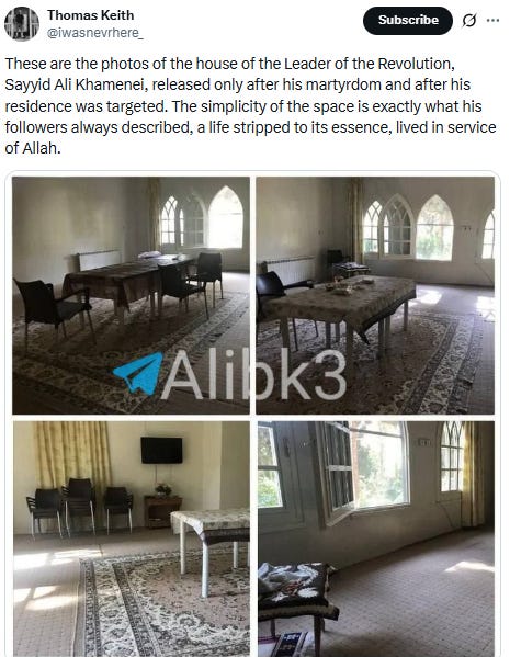 And contrast his home and the demonstration of a lived principle with Trump’s new White House ballroom. Contrast Khamenei’s unadorned lifestyle with Trump’s obsession with the gold and the gaudy, with ostentatious displays of wealth. It’s all completely sick-making and grotesque.