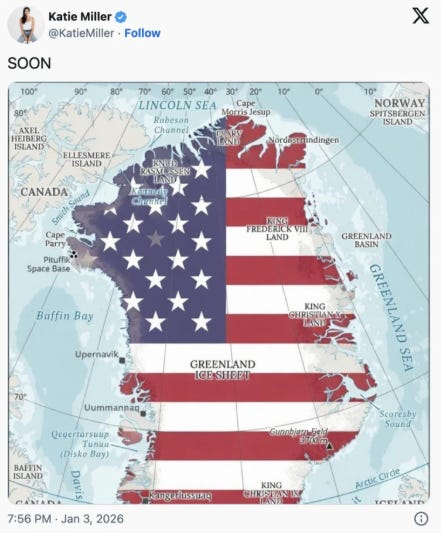 Katie Miller, a former spokesperson for Elon Musk’s DOGE department, and the wife of neo-Nazi Trump aide Stephen Miller, tweeted last week that the US would annex Greenland ‘soon.’