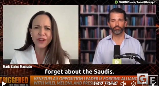 And the US puppet that comes to power after Maduro, most likely Maria Corina Machado, will gladly hand those reserves over. She also said so herself. In an interview with Donald Trump Jr in October (yes, you read that right), she said, with a frantic look in her eyes, “Forget Saudi Arabia, I mean we have more oil than them, I mean endless possibilities! We will privatize our entire industry for you. American companies will profit greatly!” Machado is also a crazed Zionist who has described Israel’s struggle as Venezuela’s struggle. This is the woman who just won the Nobel Peace Prize. It’s all so wildly outrageous and transparently evil that it would be funny if the consequences for millions of people weren’t life or death.