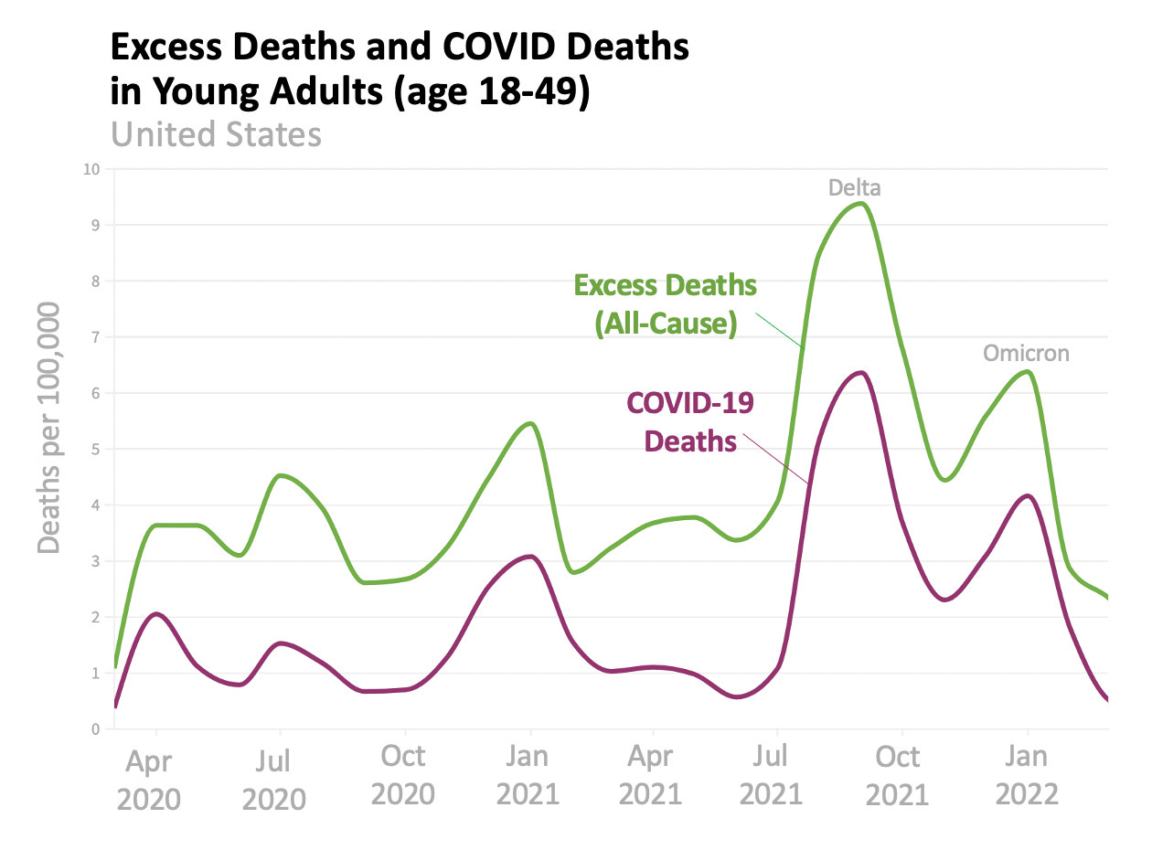 All-cause excess deaths in young adults also correlated uncannily with covid waves, as you can see here.