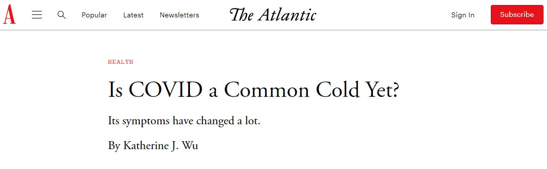 This was just one occasion among many where dodgy scientists, via dodgy reporters, encouraged us to think about covid as being like a cold. In December 2022, The Atlantic asked Is Covid A Common Cold Yet? The idea that soon Sarscov2 would become a different virus to that scary one from 2020 was pushed continually.